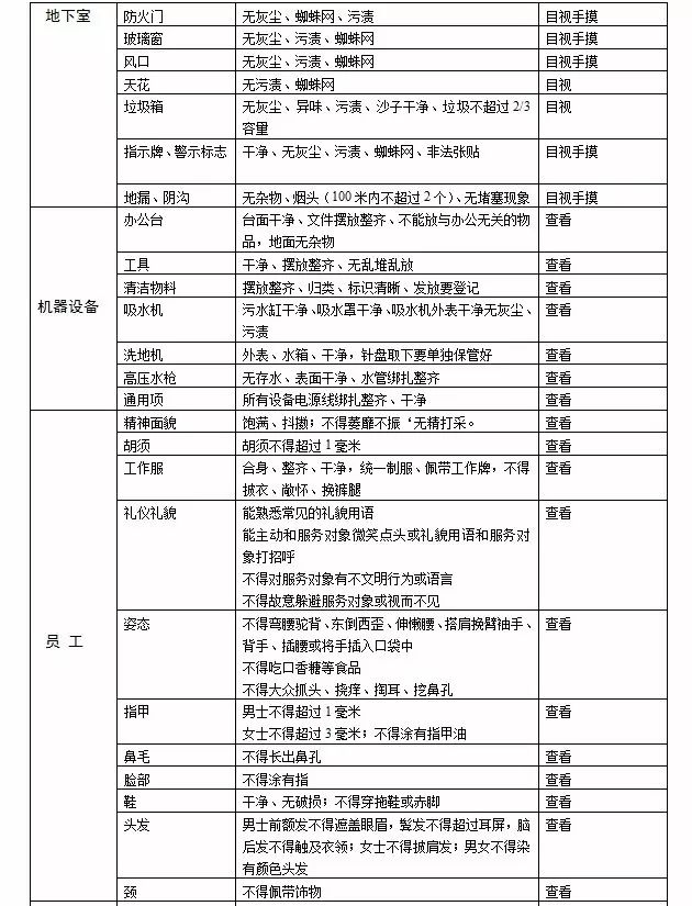 3、對(duì)照清潔工作標(biāo)準(zhǔn),檢查清潔工是否在規(guī)定的時(shí)間,完成了規(guī)定的任務(wù),并達(dá)到規(guī)定的標(biāo)準(zhǔn)。