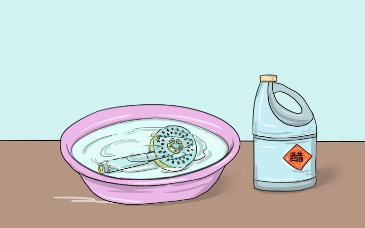 在臉盆里放些水再加上醋,把噴頭取下來浸泡